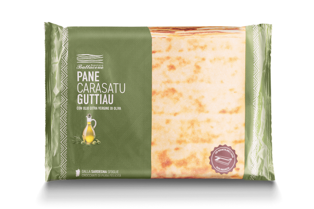 Il Pane Carasatu Guttiau da 400g, confezionato in una pratica vaschetta "Apri e Chiudi". Questo Pane Carasatu viene condito con dell'ottimo olio extravergine d'oliva, salato leggermente in superficie e poi nuovamente infornato per una doratura finale. Il risultato è un pane dal sapore ricco e avvolgente, perfetto per accompagnare tutti i pasti con un gusto più marcato.